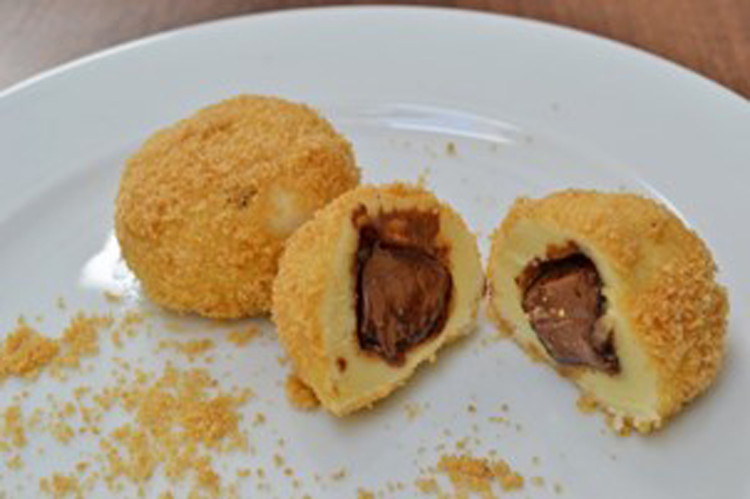 Anschließend aus dem Teig kleine Taler formen und die klein geschnittenen Nougatstücke oder Nutella einlegen. Die gefüllten Teigstücke zusammenklappen und zu Knödeln formen.