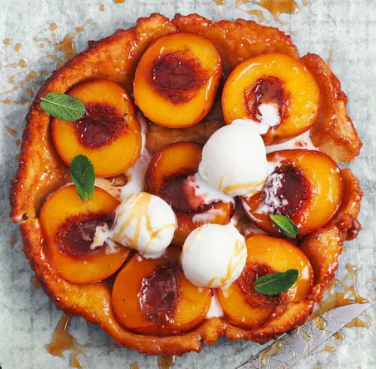 Pfirsiche waschen, pelzige Haut mit einem Küchentuch abreiben. Früchte halbieren und entsteinen. Pfirsiche mit der Schnittfläche nach unten eng in die Form legen, am Rand etwas Platz lassen für den Teig. Teig auswallen: Mürbeteig auf wenig Zucker ca. 3 mm dick in der Grösse des Blechs auswalken. Mithilfe des Nudelwalkers anheben und über die Pfirsiche decken. Rand gut nach unten drücken. Teig mit einer Gabel einige Male einstechen.