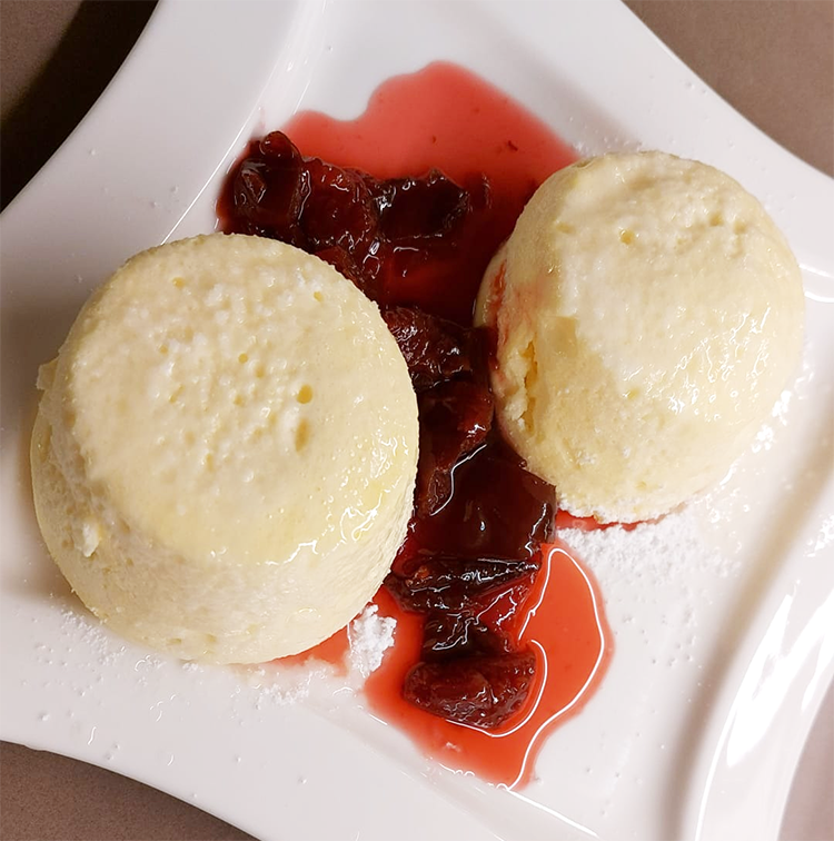 Das Rohr vorsichtig öffnen, dass das Soufflé nicht zusammenfällt und mit Beilage servieren (Zwetschgenröster,....)
