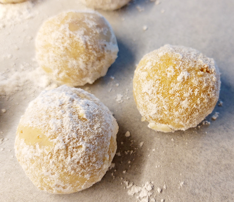 Den Teig zu einer 3-4cm dicken Rolle formen, scheiben abscheniden und mit der Hand Kugeln rollen und auf das Backbleck mit Backpapier legen, anshcließend ca. 15 Minuten im auf 180° vorgehizten Rohr backen