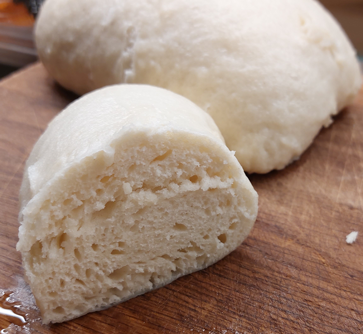 3 längliche Knödel (ca. 10 - 15 cm lang, 5 cm dick) aus dem Teig formen, über Dunst ca. 25 Minuten garen lassen..
