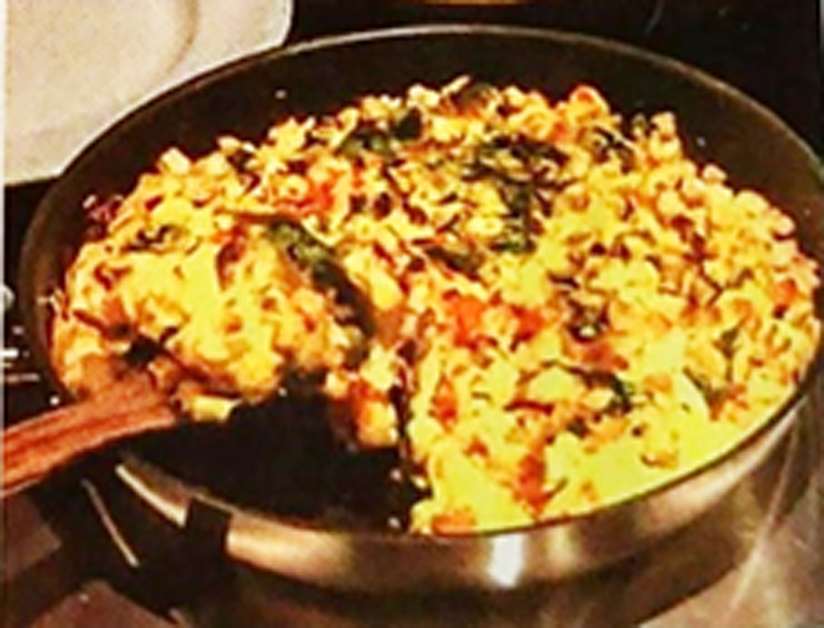 In einer breiten Pfanne (ca. 30 cm) Butter zergehen lassen, Zwiebel und Knoblauch darin anlaufen lassen. Knödelbrot dazugeben. locker durchmischen.