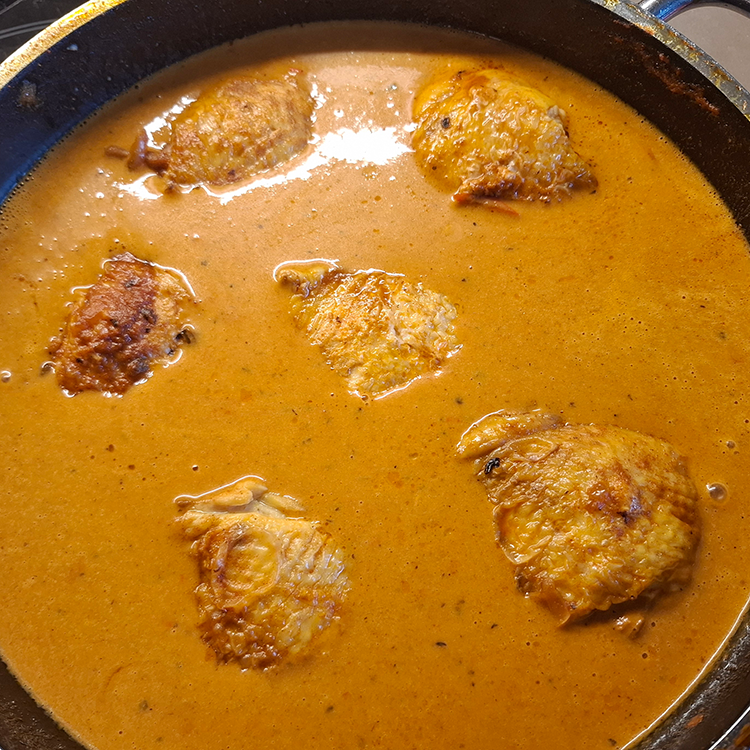 Hähnchenteile wieder hineinlegen und nochmals erwärmen.