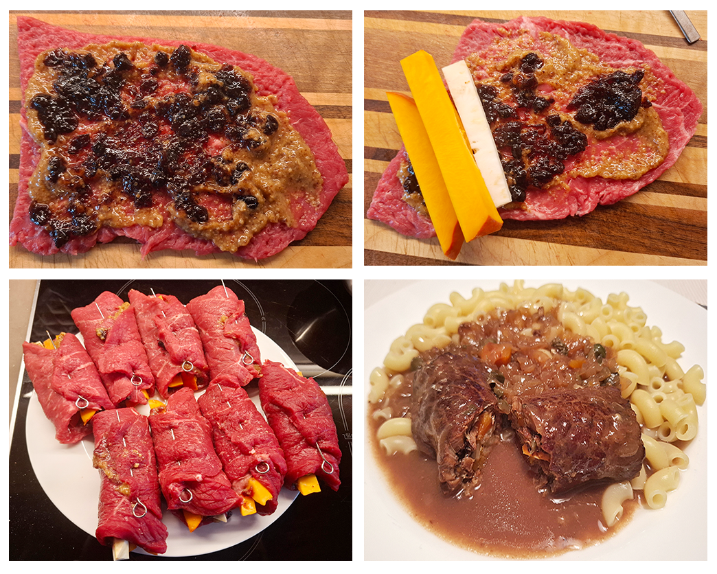 Rindschnitzel klopfen, mit dem Senf bestreichen und dicke "Streifen" (ca. 7mm) auf die Rindsrouladen legen, Preiselbeermarmelade darauf verteilen.