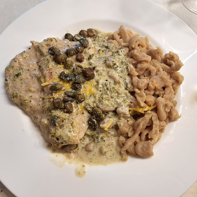 1 Biozitrone (Schale), Kapernbeeren Butter, Olivenöl, Salz, Pfeffer, Mehl